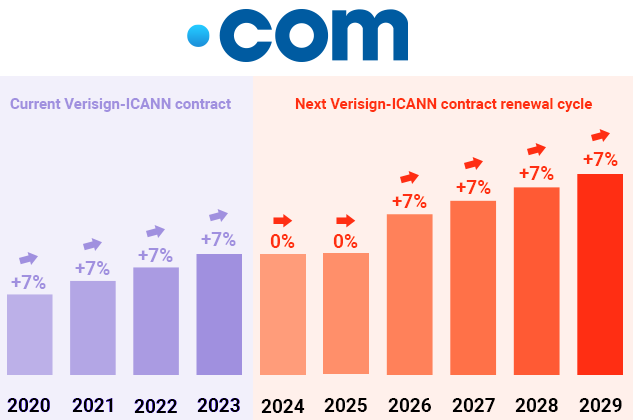 Verisign (Registry for .COM TLD) announced that it will change the wholesale price for .com registration and renewals from $7.85 to $8.39 for all registrars. The price increase will be reflected on September 1, 2021.